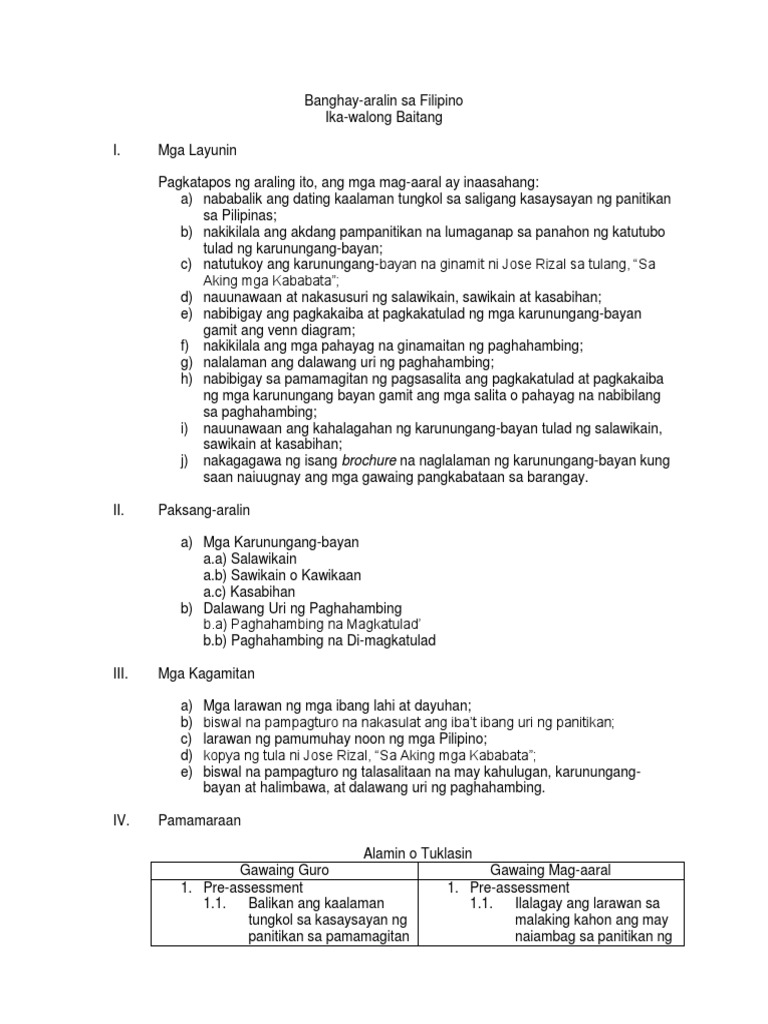 Aralin 1 1 Karunungang Bayang Pdf Whole Brain Lesson Plan 1st Quarter Subject Filipino Unit Title Salamin Ng Kahapon U2026 Bakasin Natin Ngayon Lesson Course Hero